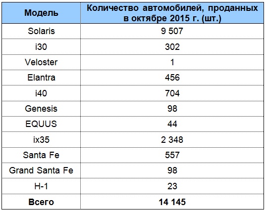 Результаты продаж новых автомобилей Hyundai, реализованных компанией «Хендэ Мотор СНГ» на территории Российской Федерации в октябре 2015 года: